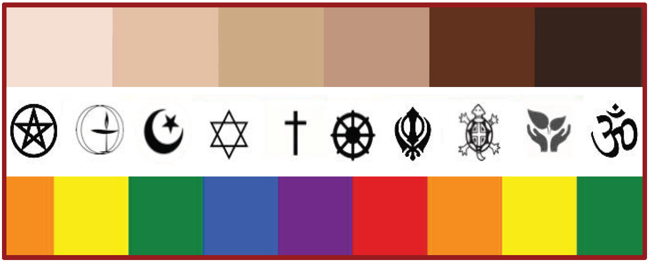 Skintones bar; icons for Pagan, Unitarian, Islam, Judaism, Christianity, Buddhist, Sikh, Native American, Earth Mother, Hindu; LGBTQX Rainbow.